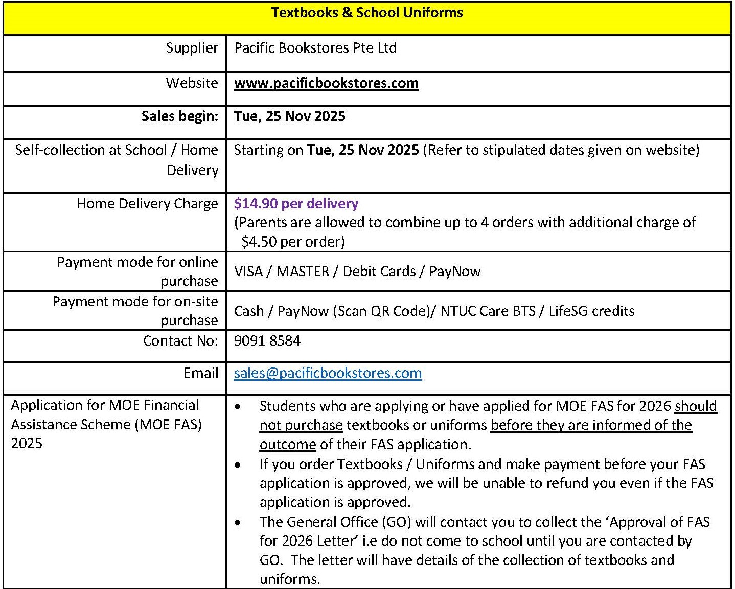 - The supplier’s website for ordering the textbooks and uniforms will begin taking orders from Thursday, 6 Nov 2025. Please access the website to: